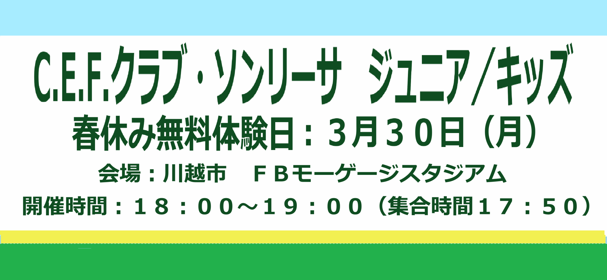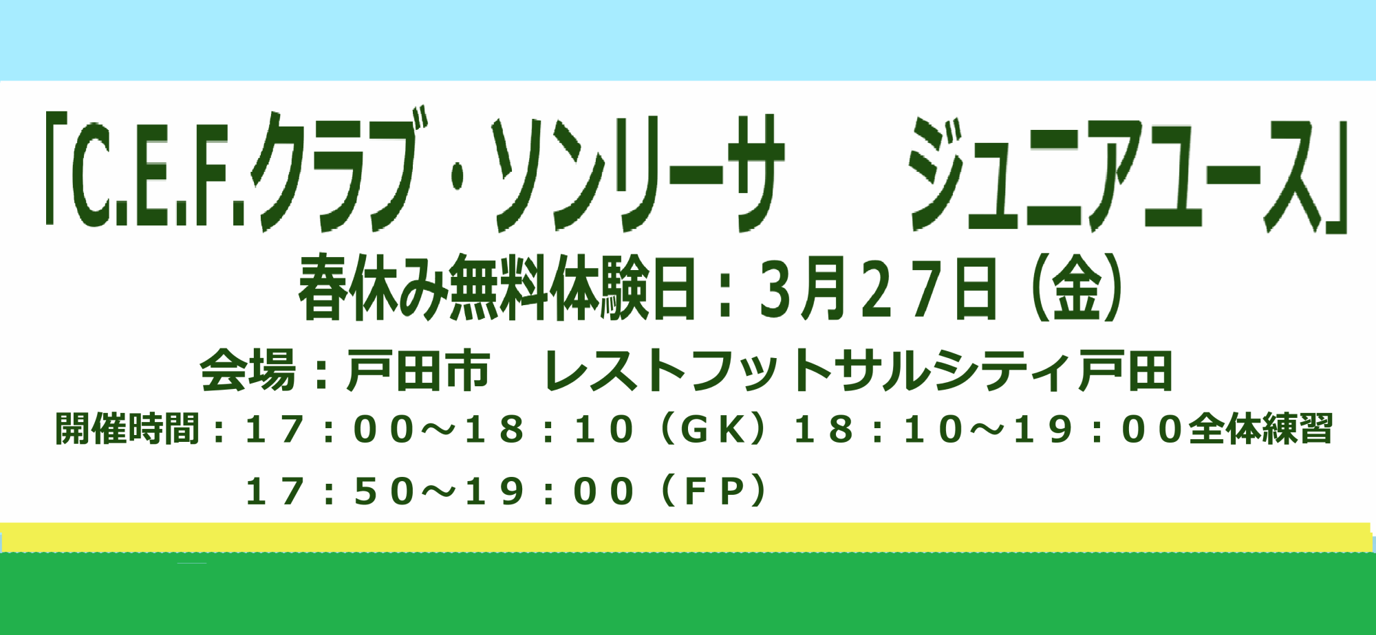 - 「JYクラス<GKコース>」が新年度より活動時間等のリニューアルにより「C.E.F.クラブ・ソンリーサジュニアユース」に名称が変更となりましたことに関するお知らせをアップしました