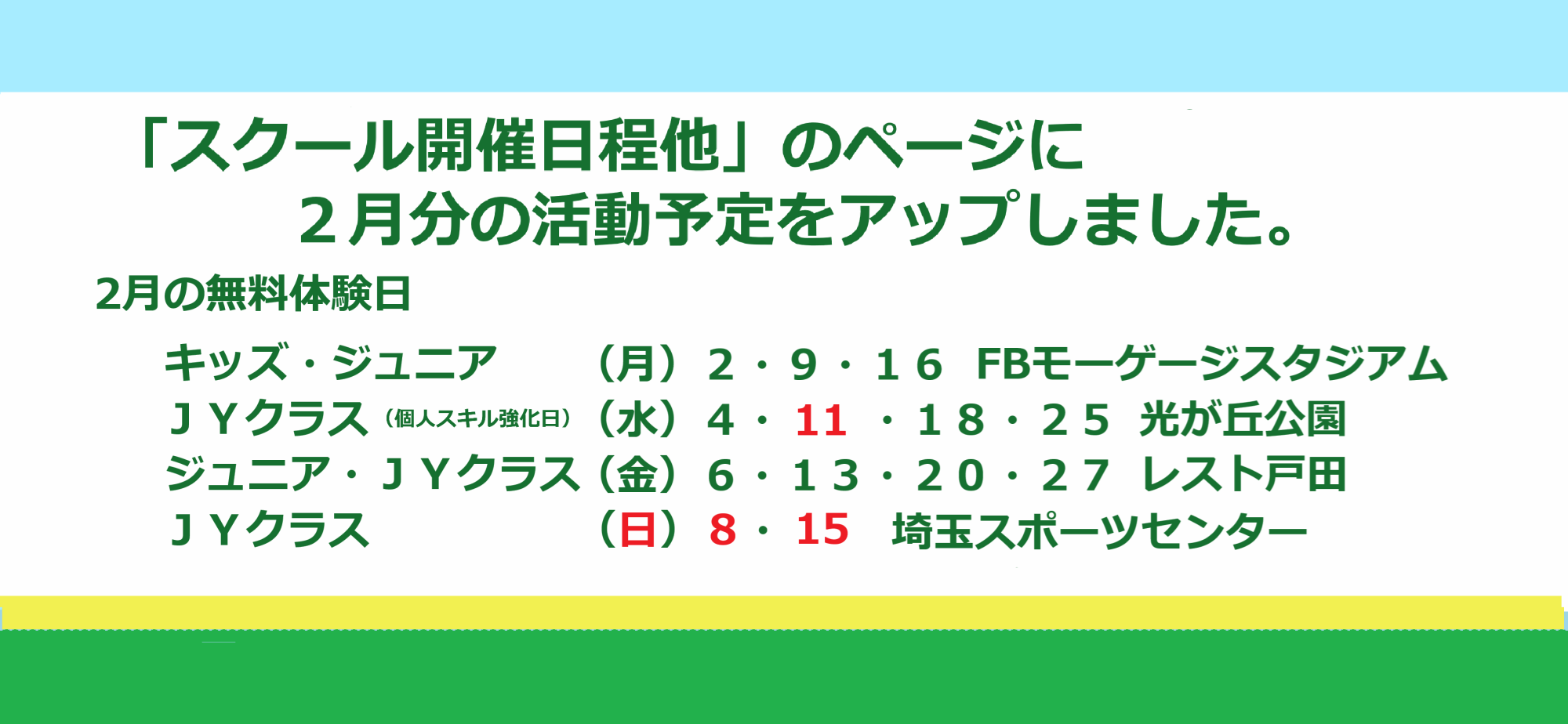 - 「スクール開催日程他」に各クラス2月分の活動予定のページを追加しました。